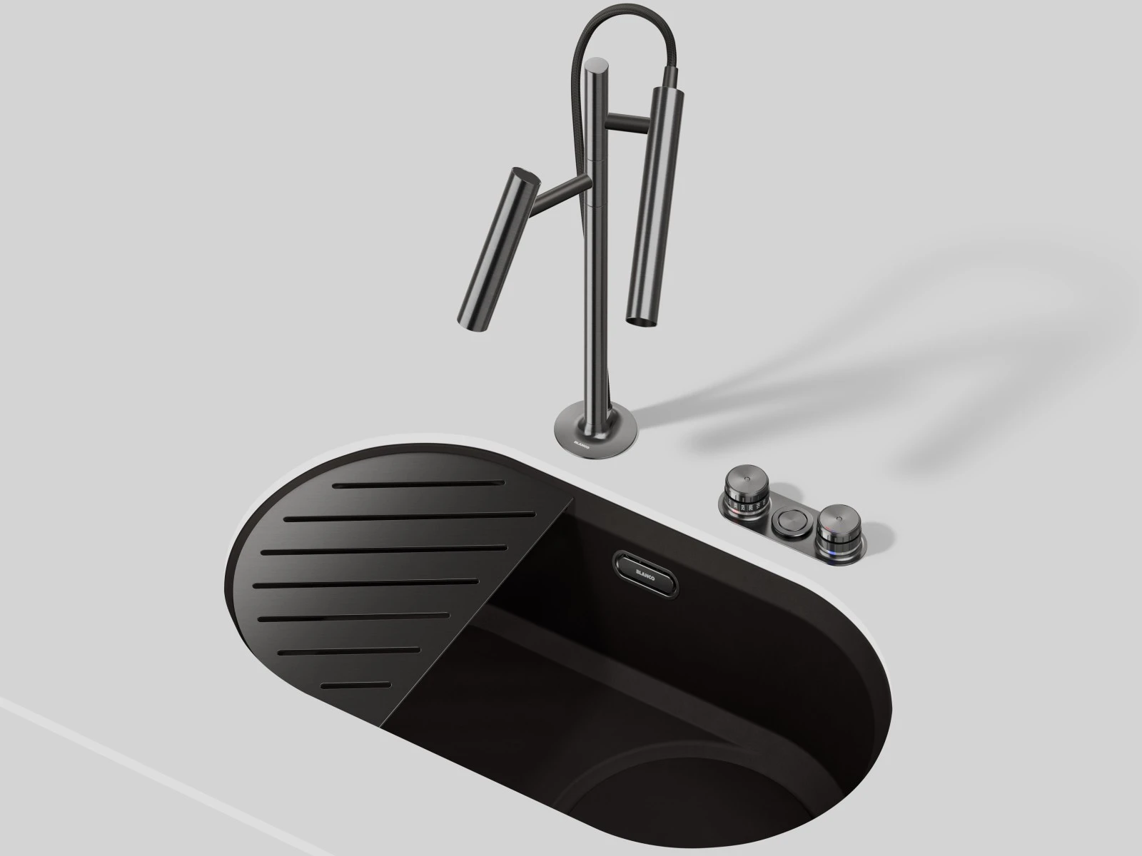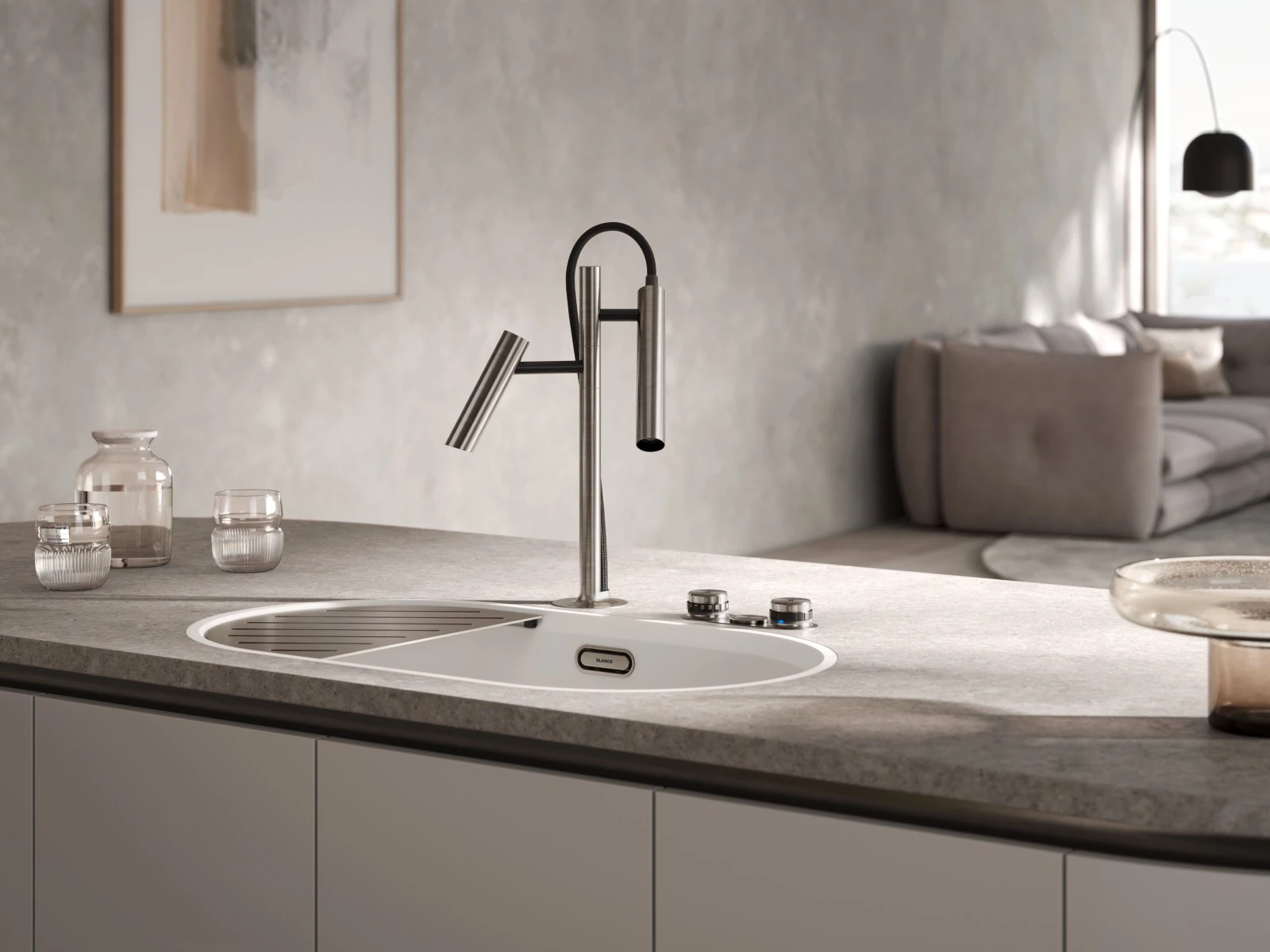 Batéria BLANCO LUNEOO-S je vizuálnym aj funkčným kontrapunktom k oválnemu tvaru drezu. Jej dizajn sa inšpiruje interiérovými svietidlami – pôsobí ako architektonický objekt, nie len ako technický prvok.