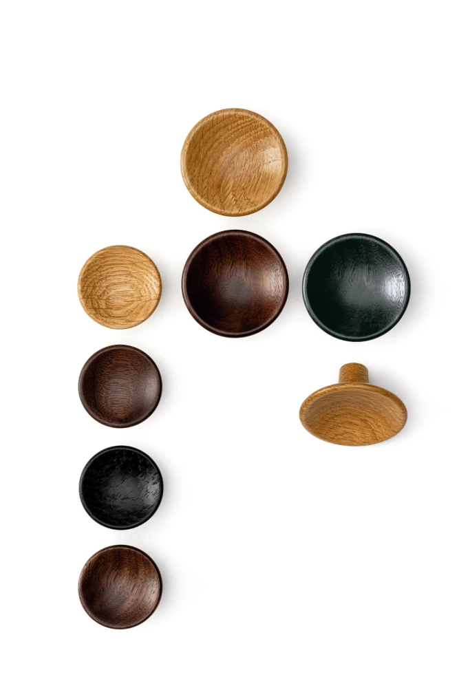 Drevená verzia je vyrobená z dreva pochádzajúceho z udržateľne obhospodarovaných lesov v Dánsku, vďaka čomu je knobka 100 % ekologická. Povrchová úprava v dubovom, orechovom alebo matnom čiernom prevedení podčiarkuje prirodzený charakter materiálu a umožňuje jednoduché kombinovanie s ďalšími úchytkami a knobkami značky Viefe. Väčší rozmer je ideálny najmä pre veľké kuchynské zásuvky, menší rozmer zasa pre jemnejšie aplikácie.