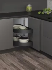 Praktický otočný karusel s dvomi polkruhovými košmi je ideálnym riešením pre efektívne využitie úložného priestoru v rohových kuchynských skrinkách. Umožňuje prehľadné usporiadanie a pohodlný prístup k uloženým predmetom. Protišmykový povrch dna zaručuje, že veci zostanú na svojom mieste aj pri otáčaní. Karusel je výškovo nastaviteľný v rozmedzí 600 – 850 mm, čo zaručuje flexibilitu pri montáži.