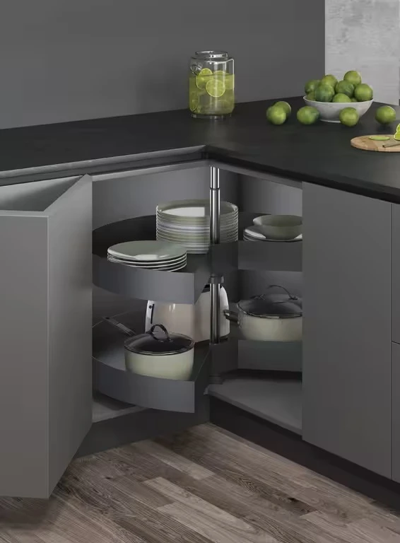 Štýlový otočný karusel s dvomi hlbokými košmi v antracitovej farbe umožňuje pohodlné a prehľadné uloženie kuchynských potrieb v rohových skrinkách. Vďaka otočnému mechanizmu s uhlom 270° získate maximálny prístup k uloženým veciam. Protišmykové dno košov zabezpečí stabilitu aj pri otáčaní. Karusel je výškovo nastaviteľný v rozmedzí 600 – 850 mm, čo zaručuje flexibilitu pri montáži.