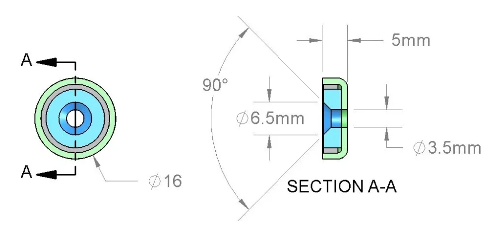 Magnet je osadený v oceľovom puzdre a vybavený otvorom s priehlbňou pre skrutku M3, čo umožňuje pevné a stabilné uchytenie do korpusu skrinky alebo konštrukcie nábytku. Je vyrobený z NdFeB (trieda N42) a pre vyššiu odolnosť proti korózii je poniklovaný (Ni-Cu-Ni).
