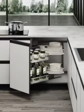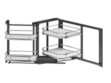 Prémiové riešenie pre rohové skrinky, ktoré kombinuje elegantný vzhľad s maximálnou funkčnosťou. Vďaka výsuvnému rámu s tlmením sa koše vysunú do priestoru a sprístupnia aj inak nedostupné časti slepého rohu. Chrómové koše s plným dnom a protišmykovou úpravou udržia uložené veci stabilne a bezpečne.