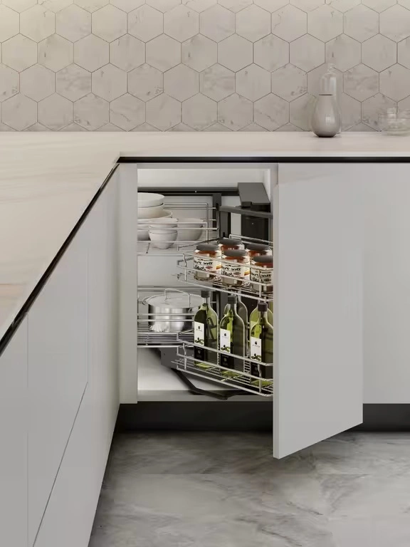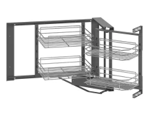 Prémiové riešenie pre rohové skrinky, ktoré kombinuje elegantný vzhľad s maximálnou funkčnosťou. Vďaka výsuvnému rámu s tlmením sa koše vysunú do priestoru a sprístupnia aj inak nedostupné časti slepého rohu.