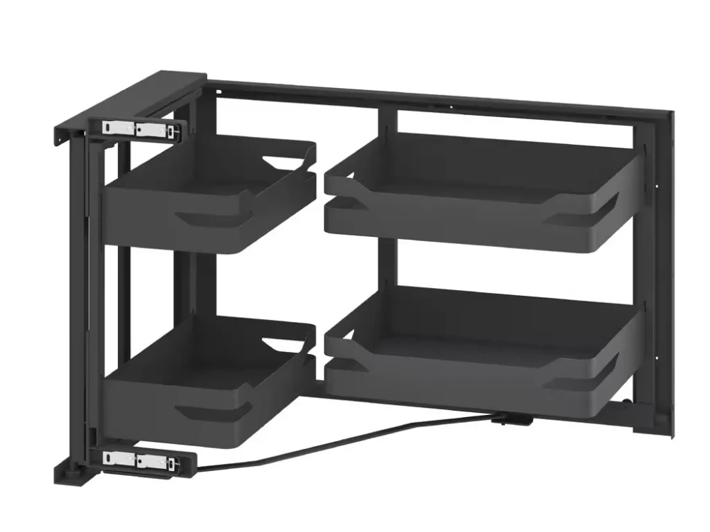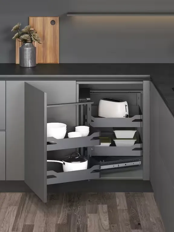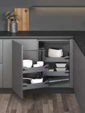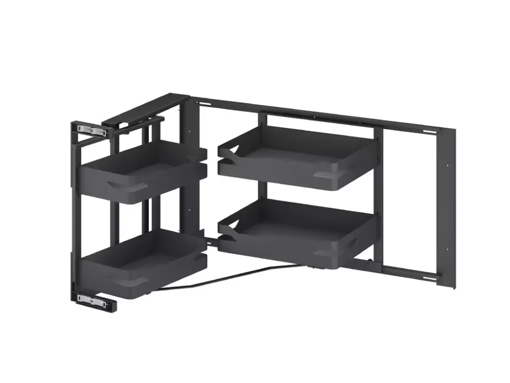 Moderné a praktické riešenie pre rohové skrinky, ktoré umožňuje maximálne využitie inak ťažko dostupného priestoru. Mechanizmus vyťahuje vnútorné koše automaticky pri otvorení dvierok a vďaka tlmenému dovieraniu sa ticho zasunú späť. Protišmykový povrch košov zabezpečuje stabilitu uložených predmetov. Vhodné pre korpusy so šírkou 900 mm.