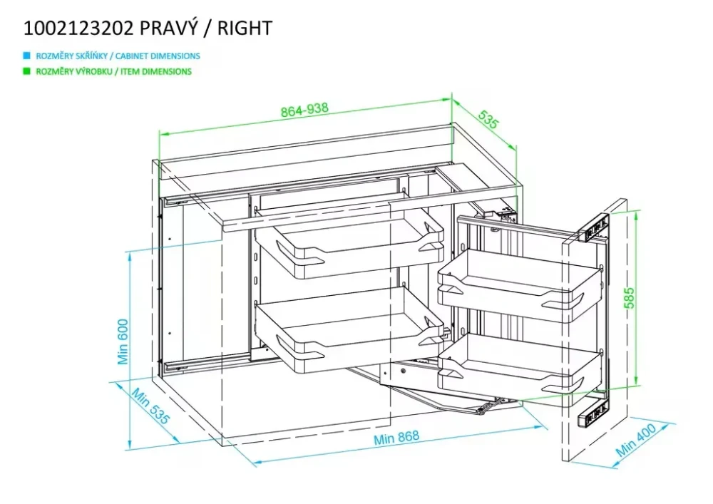 Moderné a praktické riešenie pre rohové skrinky, ktoré umožňuje maximálne využitie inak ťažko dostupného priestoru. Mechanizmus vyťahuje vnútorné koše automaticky pri otvorení dvierok a vďaka tlmenému dovieraniu sa ticho zasunú späť. Protišmykový povrch košov zabezpečuje stabilitu uložených predmetov. Vhodné pre korpusy so šírkou 900 mm.