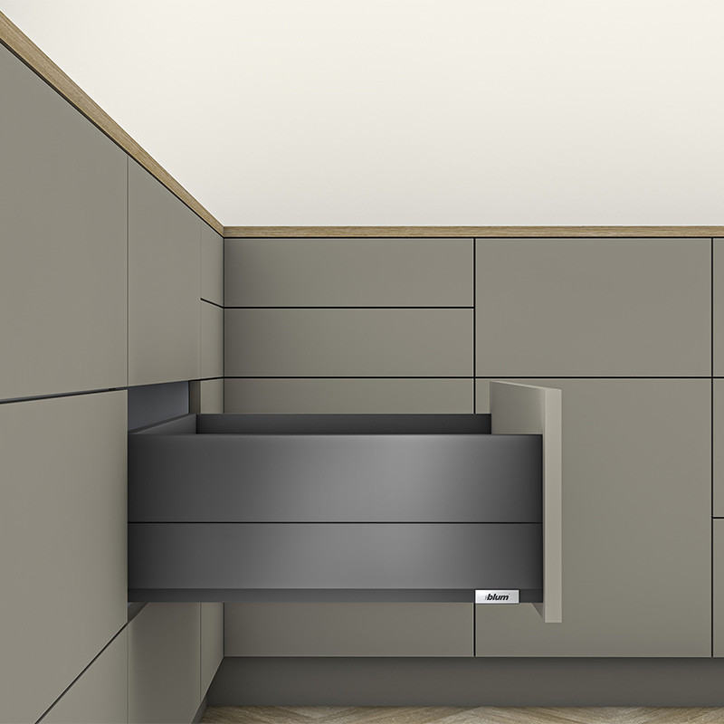 Úzka bočnica, ľahučký chod, montáž čela bez použitia náradia. Nastavenie čela v 3 smeroch. Hĺbka: 400 mm. Farba: antracit / šedá orion (BLUM). Sada obsahuje: bočnice s krytkami (1 pár), držiak chrbta E (1 pár), boxcap (1 pár), korpusové lišty 40 kg (1 pár), upevnenie čela (2 ks), upevnenie čela horné (2 ks).