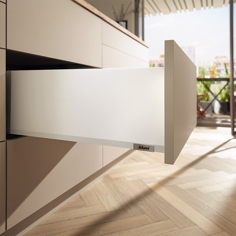 Kompletná zásuvka MERIVOBOX, výška K (bočnica 129 mm). Úzka bočnica, ľahučký chod, montáž čela bez použitia náradia. Nastavenie čela v 3 smeroch. Hĺbka: 550 mm. Farba: biela. Sada obsahuje: bočnice K s krytkami (1 pár), držiak chrbta K (1 pár), korpusové lišty 40 kg (1 pár), upevnenie čela (2 ks).