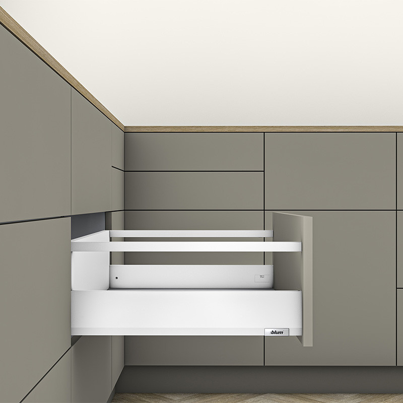 Kompletná zásuvka MERIVOBOX, výška E s relingom (bočnica 91 mm). Úzka bočnica, ľahučký chod, montáž čela bez použitia náradia. Nastavenie čela v 3 smeroch. Hĺbka: 600 mm. Farba: biela. Sada obsahuje: bočnice s krytkami (1 pár), držiak chrbta E (1 pár), reling (1 pár), korpusové lišty 40 kg (1 pár), upevnenie čela (2 ks), upevnenie čela horné (2 ks).