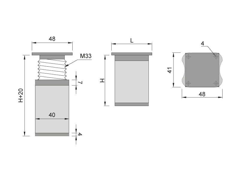 Štvorcová hliníková nožička s reguláciou výšky, určená pre kuchynské a kúpeľňové skrinky, komody, skrinky a doplnkový nábytok. Slúži na stabilizáciu, vyrovnanie a vizuálne oddelenie nábytku od podlahy. Výšková regulácia do 20 mm umožňuje presné vyrovnanie pri nerovnostiach podlahy. Spodná plastová pätka chráni podlahu pred poškriabaním. Nožička nie je nosná. Nábytok musí byť vždy pevne ukotvený do steny v súlade s montážnymi pokynmi výrobcu.