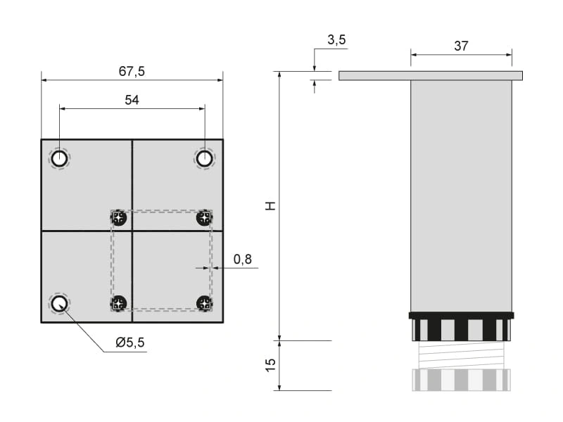 Nožička sa montuje priamo na spodnú časť nábytku pomocou montážnej platničky. Integrovaný regulačný mechanizmus umožňuje jednoduché a presné nastavenie výšky po osadení nábytku.