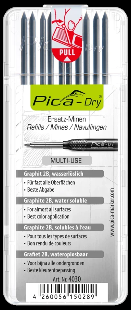 Model Pica DRY 3030 je plne kompatibilný so širokou škálou náhradných túh. Pre maximálnu všestrannosť odporúčame kombináciu s univerzálnymi grafitovými tuhami 4030 (2B) alebo špeciálnymi farebnými tuhami pre tmavé a mastné povrchy. Ostatné varianty a sady nájdete v súvisiacich produktoch.