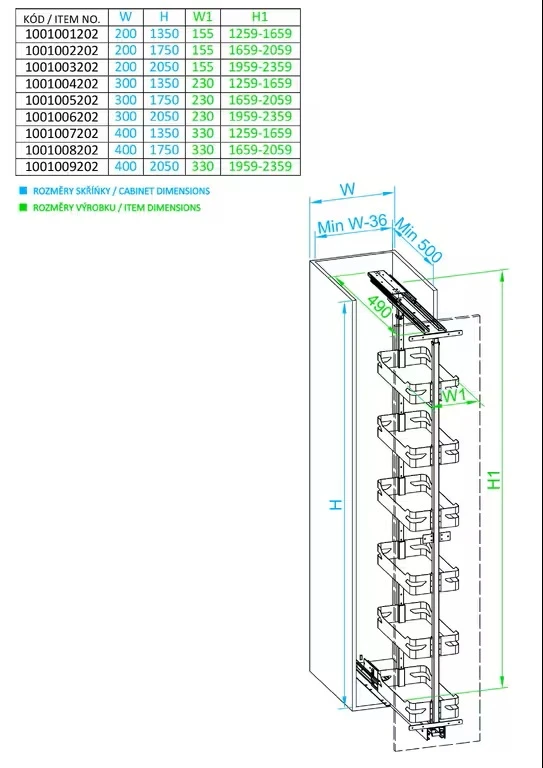 Rozmer výrobku (Š x H x V): 330 x 490 x 1259-1659mm