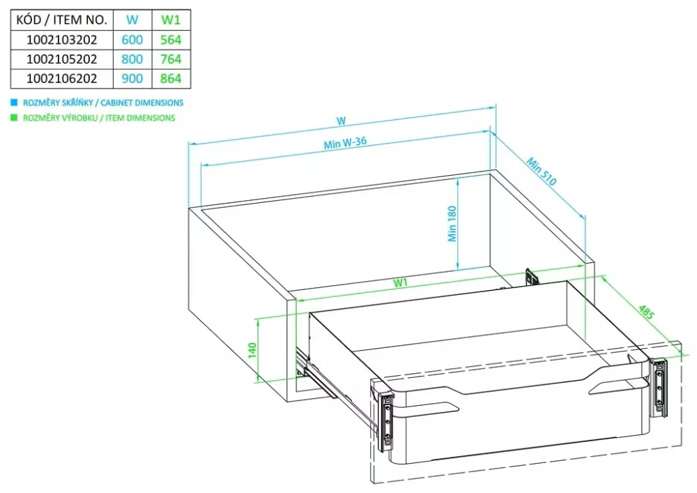 Obsah balenia: kôš s plným dnom a protišmykovým povrchom, plnovýsuv s tlmeným dovieraním, montážna sada, set pre uchytenie dvierok.