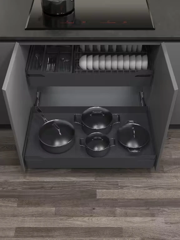 Praktická plnovýsuvná zásuvka určená pre skrinku so šírkou korpusu 900 mm. Vďaka plnovýsuvu a tlmenému dovieraniu sa zásuvka pohybuje ticho a plynulo. Súčasťou balenia je aj set pre uchytenie dvierok, ktorý umožňuje jednoduchú montáž.
